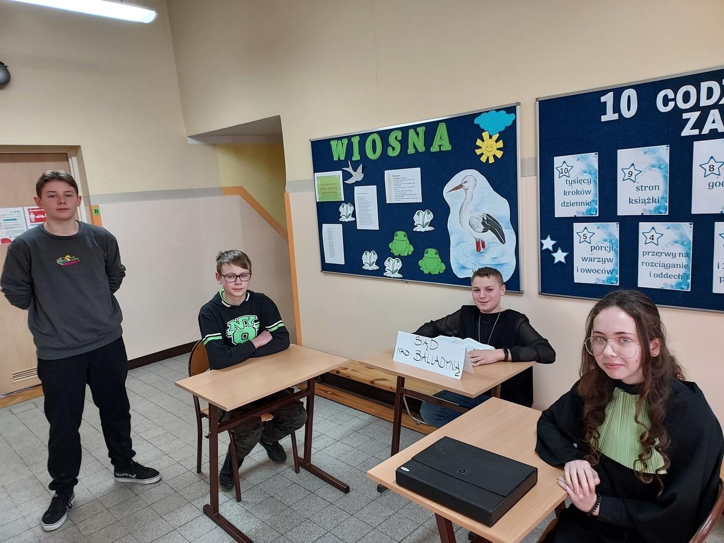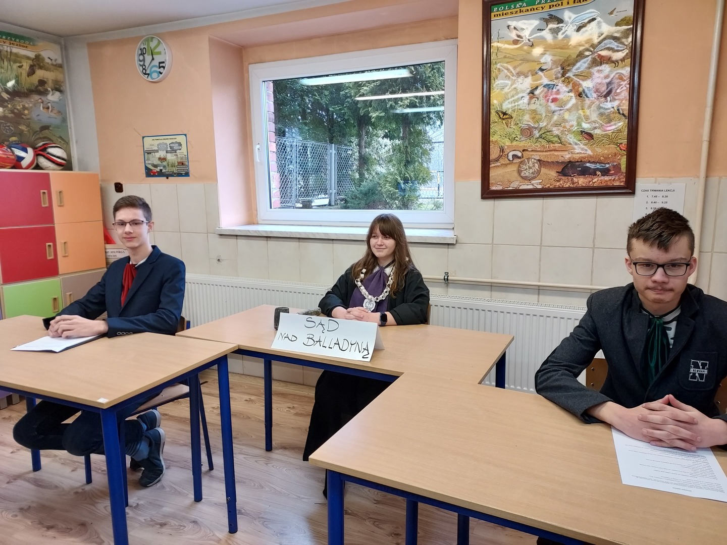 Na zakończenie omawiania dramatu Juliusza Słowackiego uczniowie klasy ósmej podsumowali oraz ocenili postępowanie tytułowej bohaterki i urządzili prawdziwy sąd nad Balladyną. Ósmoklasiści bardzo poważnie podeszli do realizacji swojego zadania, przygotowali odpowiednie stroje dla sędziego, adwokata, oskarżyciela i świadka, przynieśli właściwe rekwizyty – dowody zbrodni. Na uwagę zasługuje fakt, z jaką precyzją argumentowali mowę obronną lub oskarżycielską. Co prawda przenieśli nas w realia współczesnego świata, ale oddali ducha czasów baśniowych, legendarnych. Po drastycznych zeznaniach świadków, po oburzeniu widowni, przy wielokrotnym upominaniu sędziego o zachowanie porządku i spokoju wydano wyrok, który idealnie wpisywał się w zasadę „Nie ma zbrodni bez kary”. Balladyna została skazana na wieloletni pobyt w więzieniu. I to była inwencja twórcza uczniów, bo Słowacki wydał zupełnie inny wyrok.