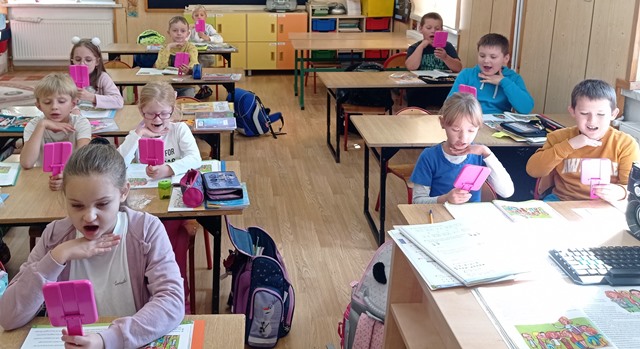 12 września w klasie drugiej, z Panią Beatą Szumilas odbyły się zajęcia wspomagające ćwiczenia motoryki twarzy i ust z wykorzystaniem lusterek. Dzięki obserwacji dzieci uczą się wymawiać poprawnie głoski i wyrazy. Przyglądając się swojemu odbiciu, mogą kształtować tę umiejętność i trenować poprawną wymowę.