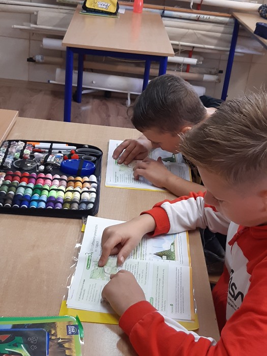 19 września podczas zajęć z edukacji polonistycznej uczniowie klasy trzeciej wykonywali ćwiczenia w odczytywaniu tekstów zapisanych pismem lustrzanym – użyli lusterek zakupionych w ramach programu „Laboratoria Przyszłości”.