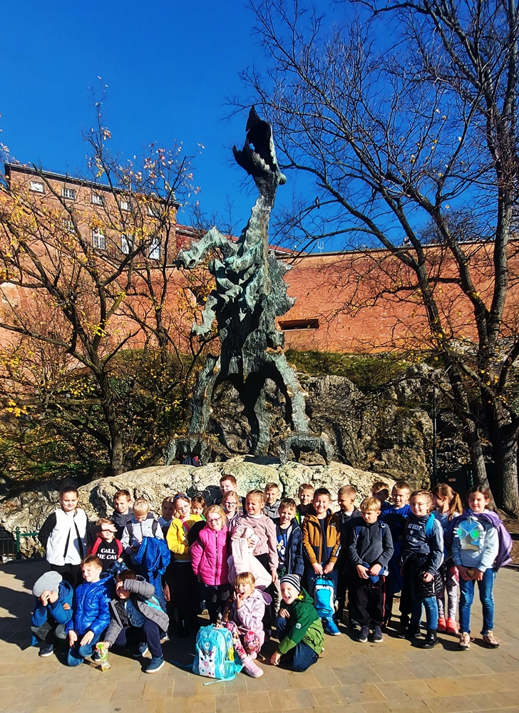 Zwiedzanie rozpoczęliśmy na Kleparzu pod pomnikiem Grunwaldzkim. Następnie przeszliśmy spacerkiem w kierunku rynku przechodząc przez baszty obronne miasta. Przespacerowaliśmy się po Sukiennicach. W drodze na Wawel mijaliśmy kościoły Św. Apostołów Piotra i Pawła oraz kościół św. Andrzeja. Zwiedziliśmy Wawel oraz obowiązkowo zrobiliśmy sobie pamiątkowe zdjęcie ze Smokiem Wawelskim.