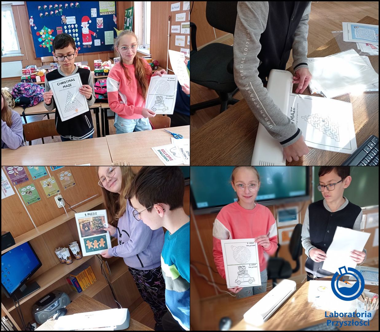 19 grudnia uczniowie klasy czwartej na lekcji języka angielskiego korzystali z laminatora i przygotowywali świąteczne gry i zabawy. Zalaminowane karty pracy przetestowali sami wykorzystując do tego mazaki, które następnie łatwo dało się zmazać, a karty mogli jeszcze wykorzystać młodsi uczniowie. W ten sposób uczniowie klasy czwartej współtworzyli materiały edukacyjne. Nauczyciel nadzorujący wykorzystanie sprzętu: J. Kłopotowska
