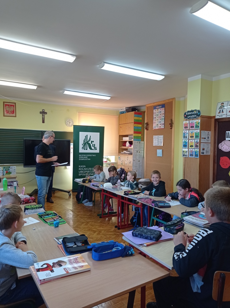 20 października uczniowie klasy 3 gościli przedstawicieli KRUS - Kasy Rolniczego Ubezpieczenia Społecznego. Panowie przeprowadzili zajęcia o bezpieczeństwie dzieci w gospodarstwie rolnym. Dzieci obejrzały ciekawe filmy na ten temat, a następnie rozwiązały zadanie konkursowe. Ci, którzy poradzili sobie najlepiej i najszybciej, zostali nagrodzeni. Gratulujemy Jakubowi, Stasiowi i Lenie.