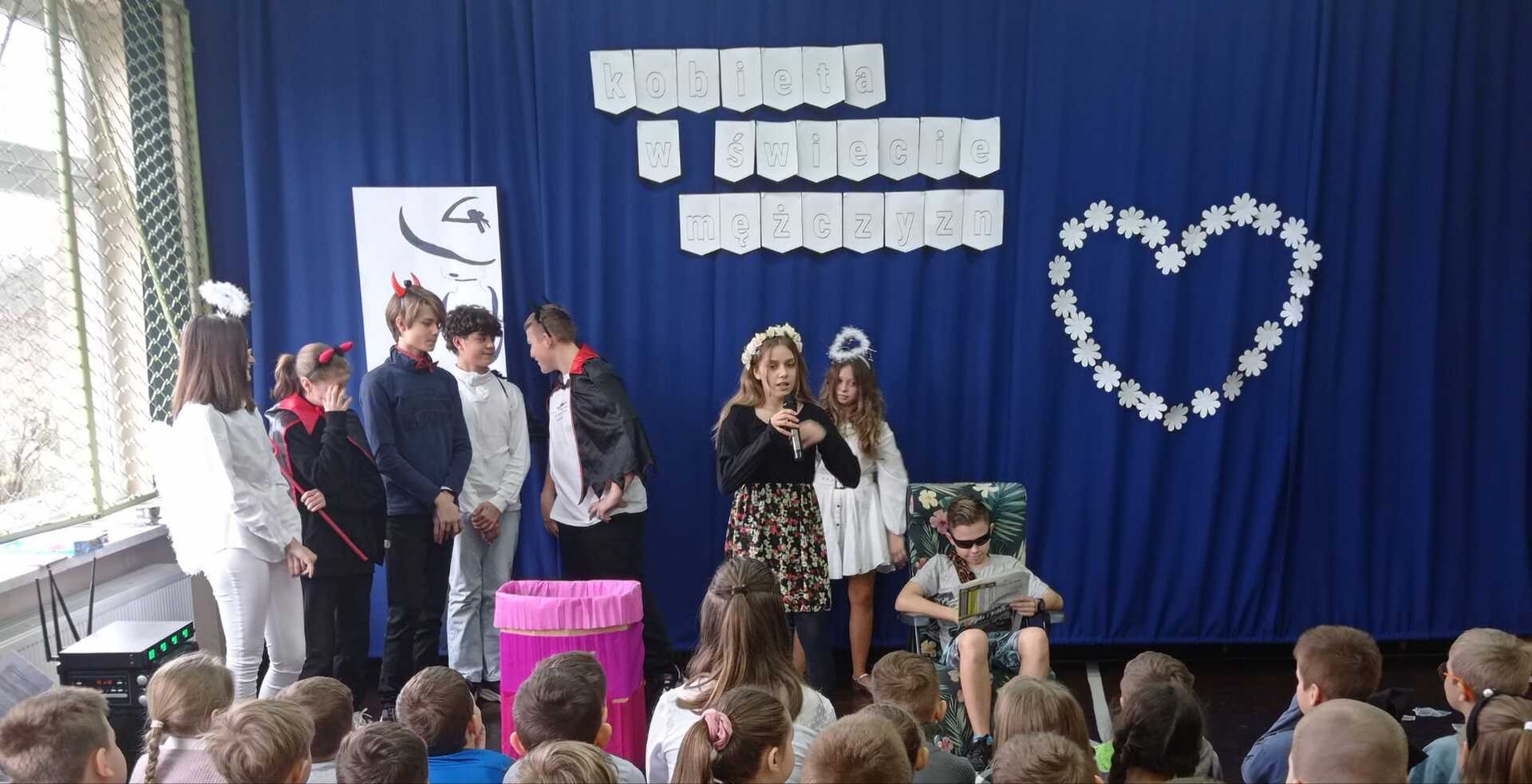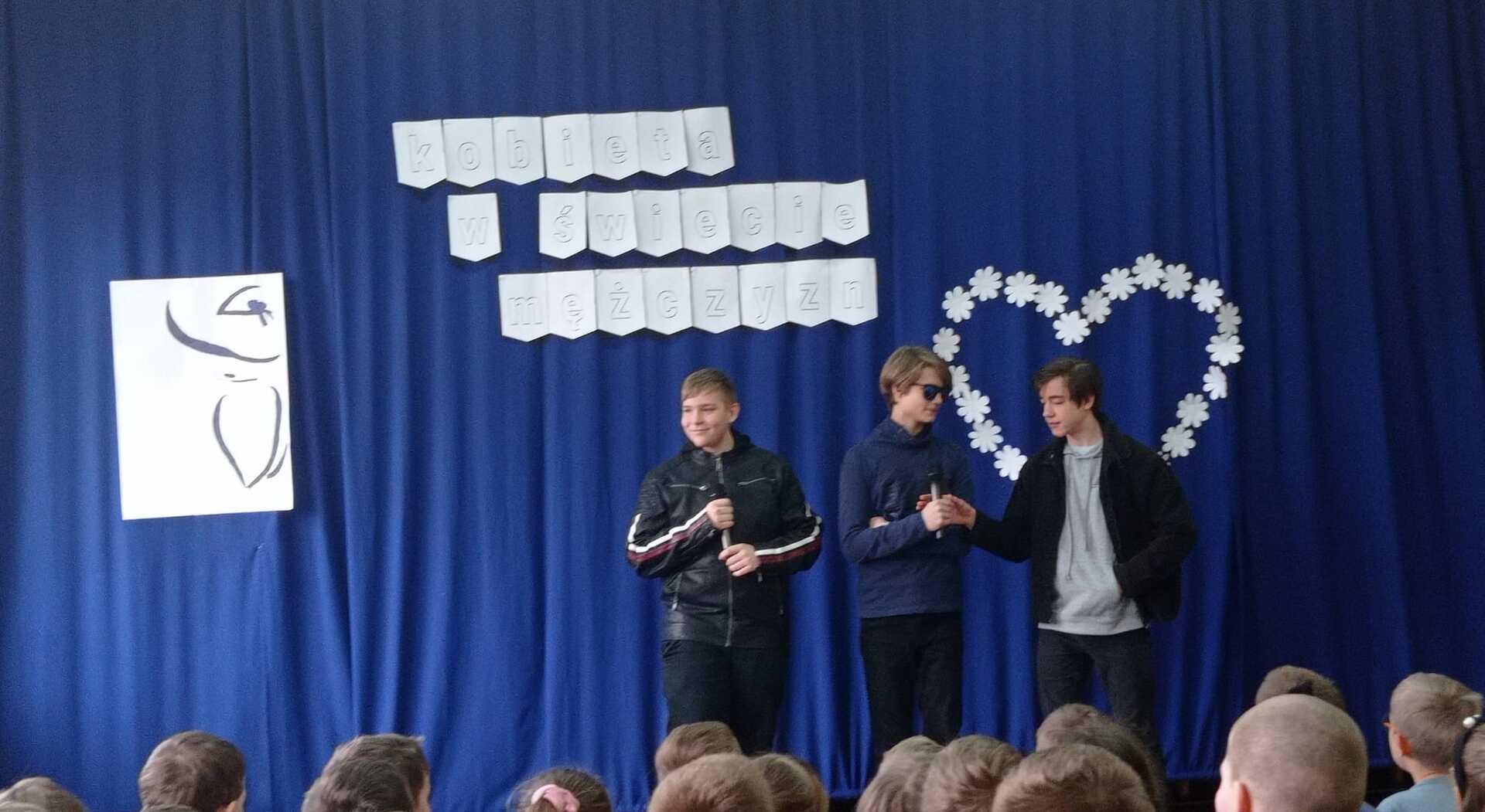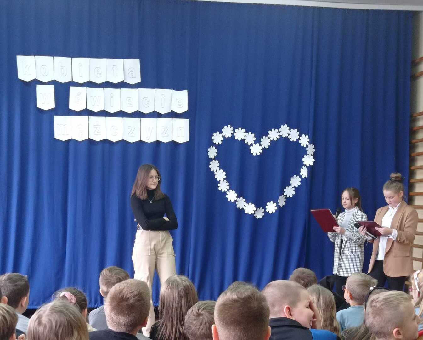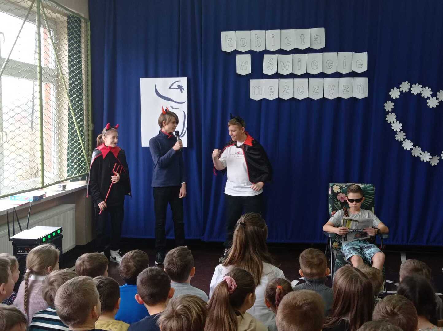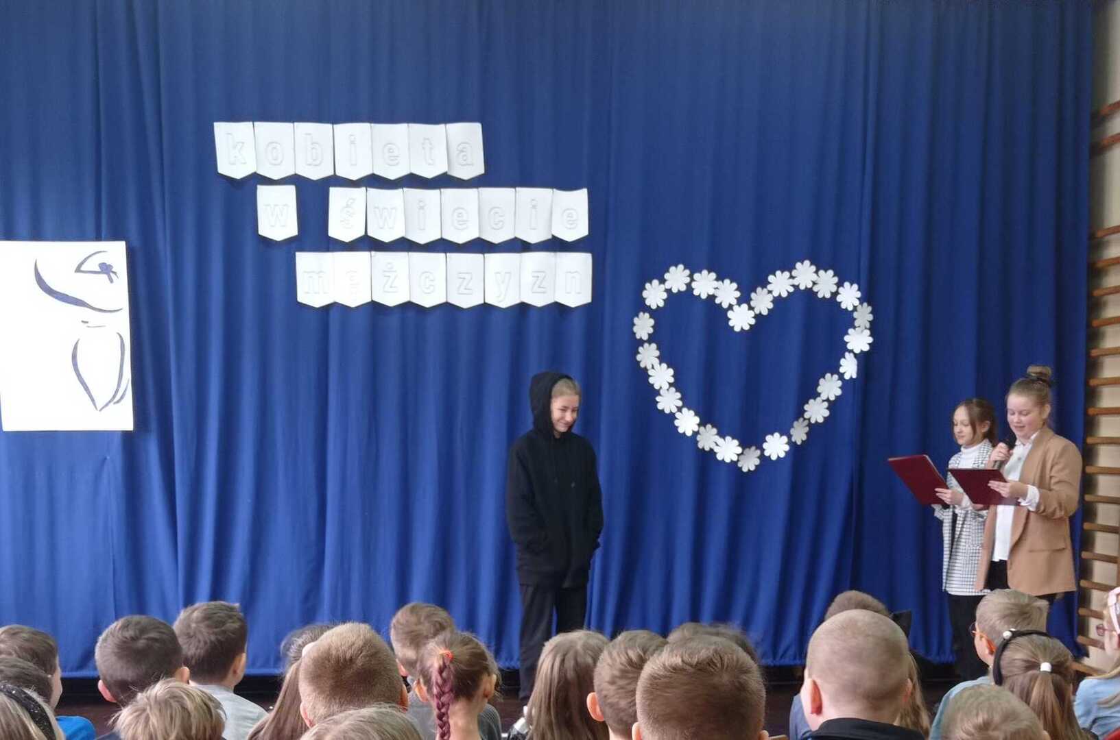 Z okazji Dnia Kobiet uczniowie klasy siódmej i ósmej przygotowali krótki, ale pełen humoru, program artystyczny. Po precyzyjnym opisie kobiety przez profesora (w tej roli wystąpił Bartek) młodzi aktorzy zaprezentowali różne oblicza pięknej części naszego globu: od czasów Adama i Ewy, przez "Żonę modną" po współczesność. Gromkim brawom nie było końca, szczególnie podobały się różne wcielenia aktorskie ósmoklasisty Igora. Ponadto program artystyczny uświetnił przepiękny wokal Ani i Vanessy oraz chłopców: Roberta, Bartka i Igora.