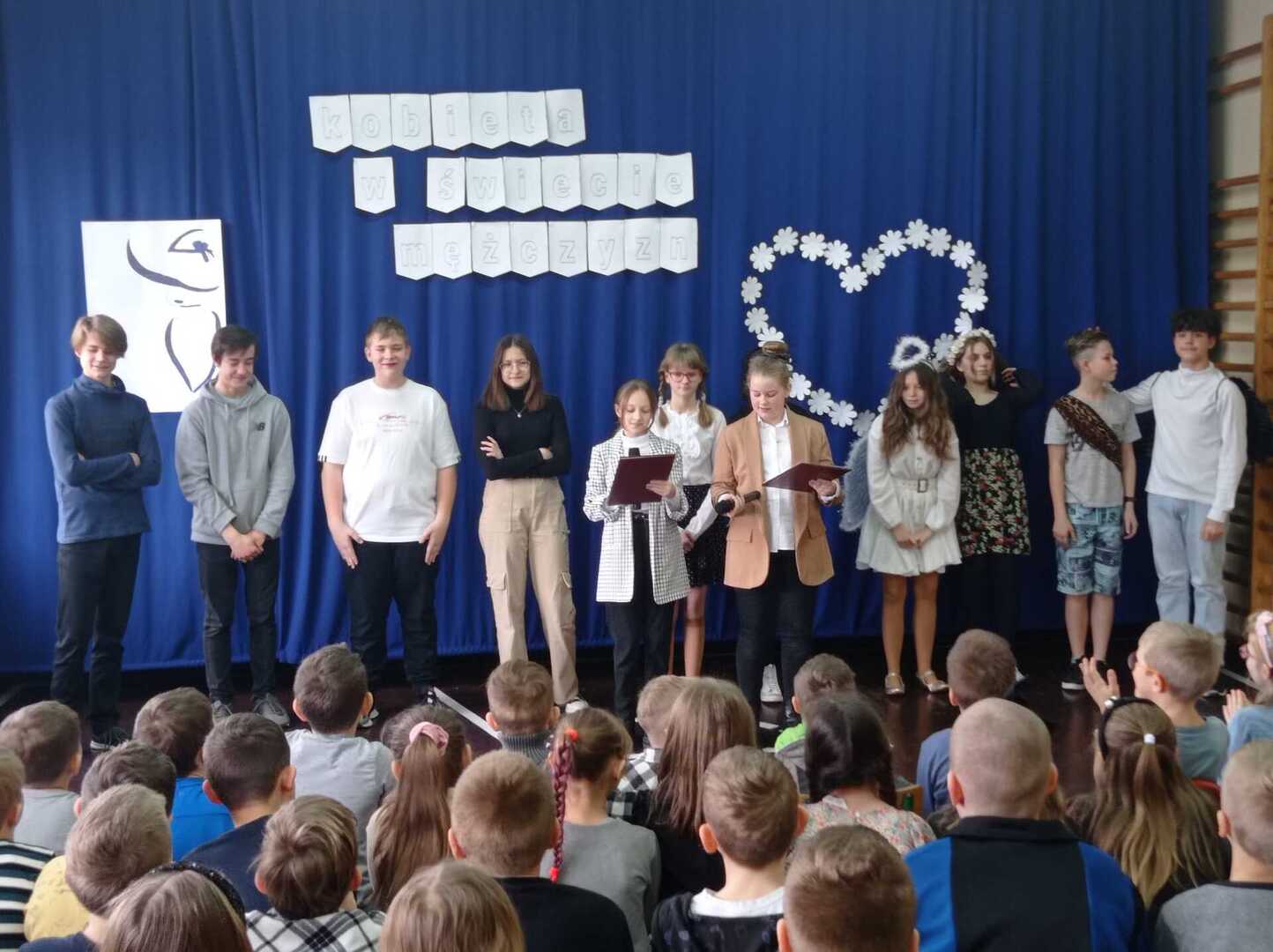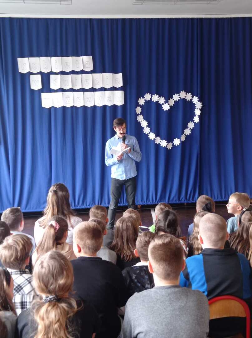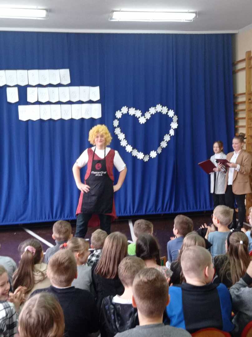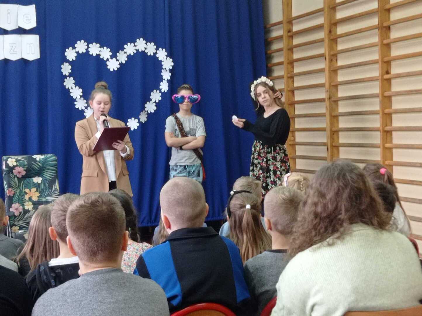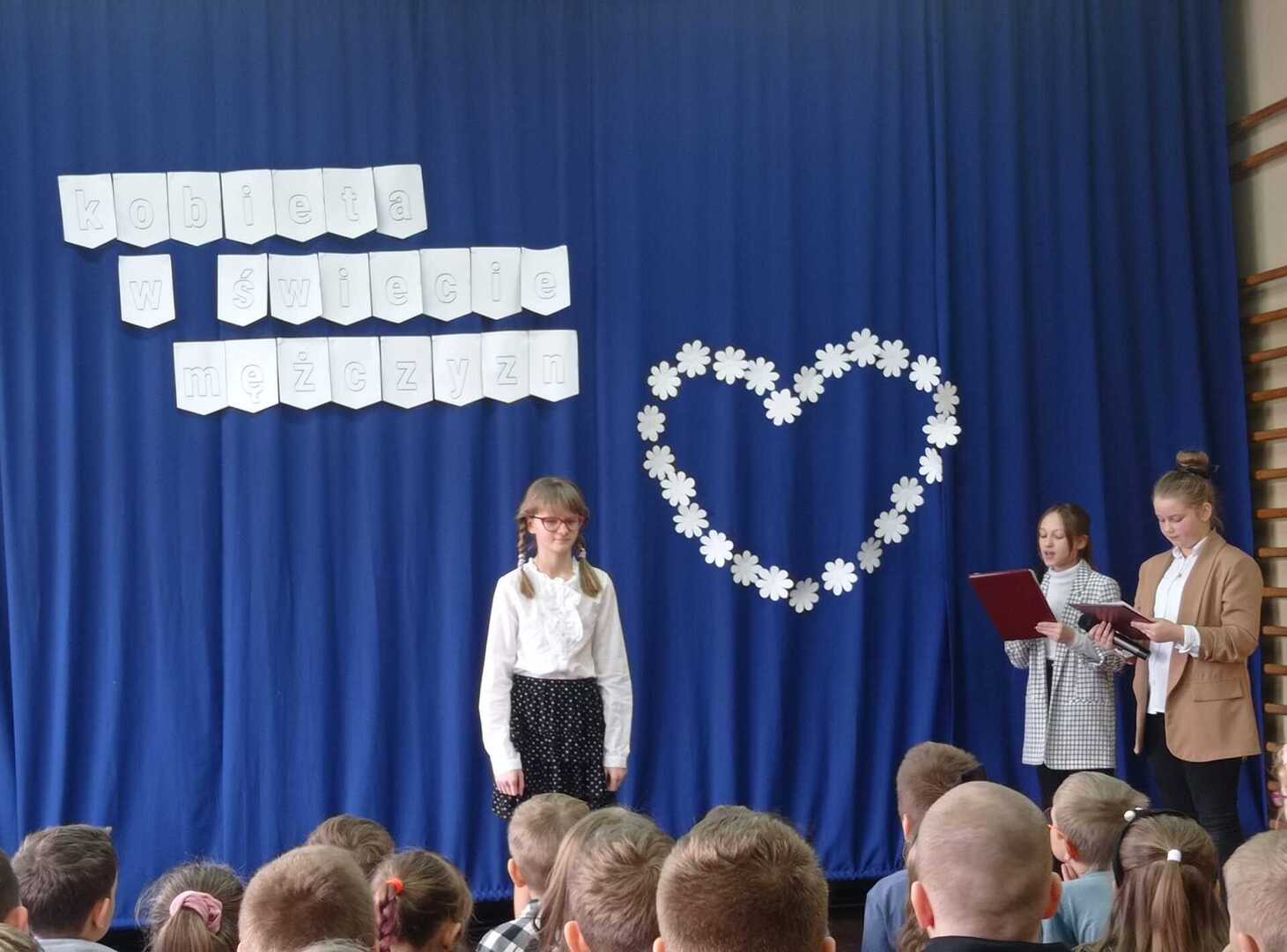 Z okazji Dnia Kobiet uczniowie klasy siódmej i ósmej przygotowali krótki, ale pełen humoru, program artystyczny. Po precyzyjnym opisie kobiety przez profesora (w tej roli wystąpił Bartek) młodzi aktorzy zaprezentowali różne oblicza pięknej części naszego globu: od czasów Adama i Ewy, przez "Żonę modną" po współczesność. Gromkim brawom nie było końca, szczególnie podobały się różne wcielenia aktorskie ósmoklasisty Igora. Ponadto program artystyczny uświetnił przepiękny wokal Ani i Vanessy oraz chłopców: Roberta, Bartka i Igora.