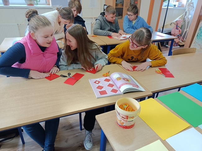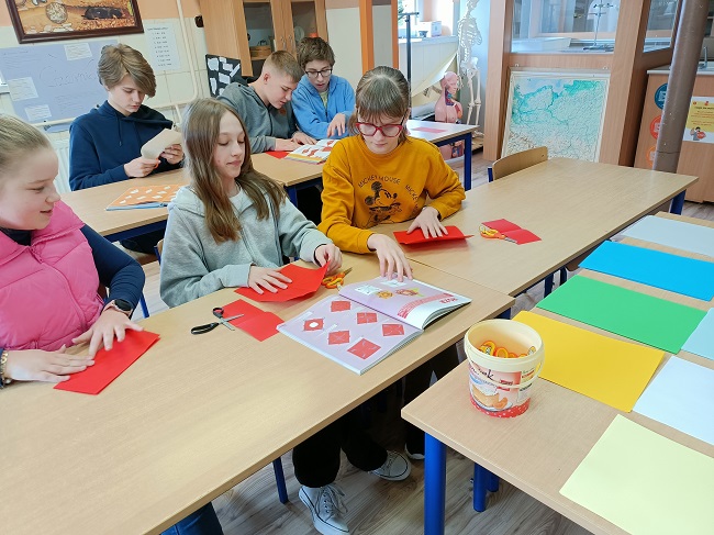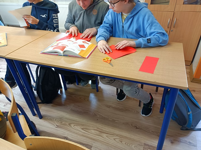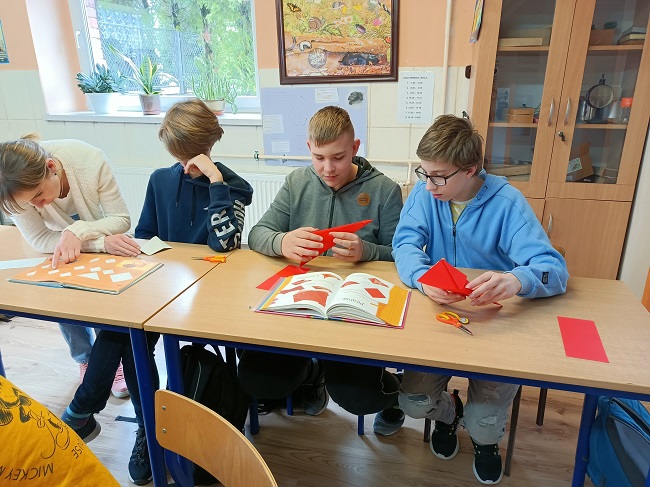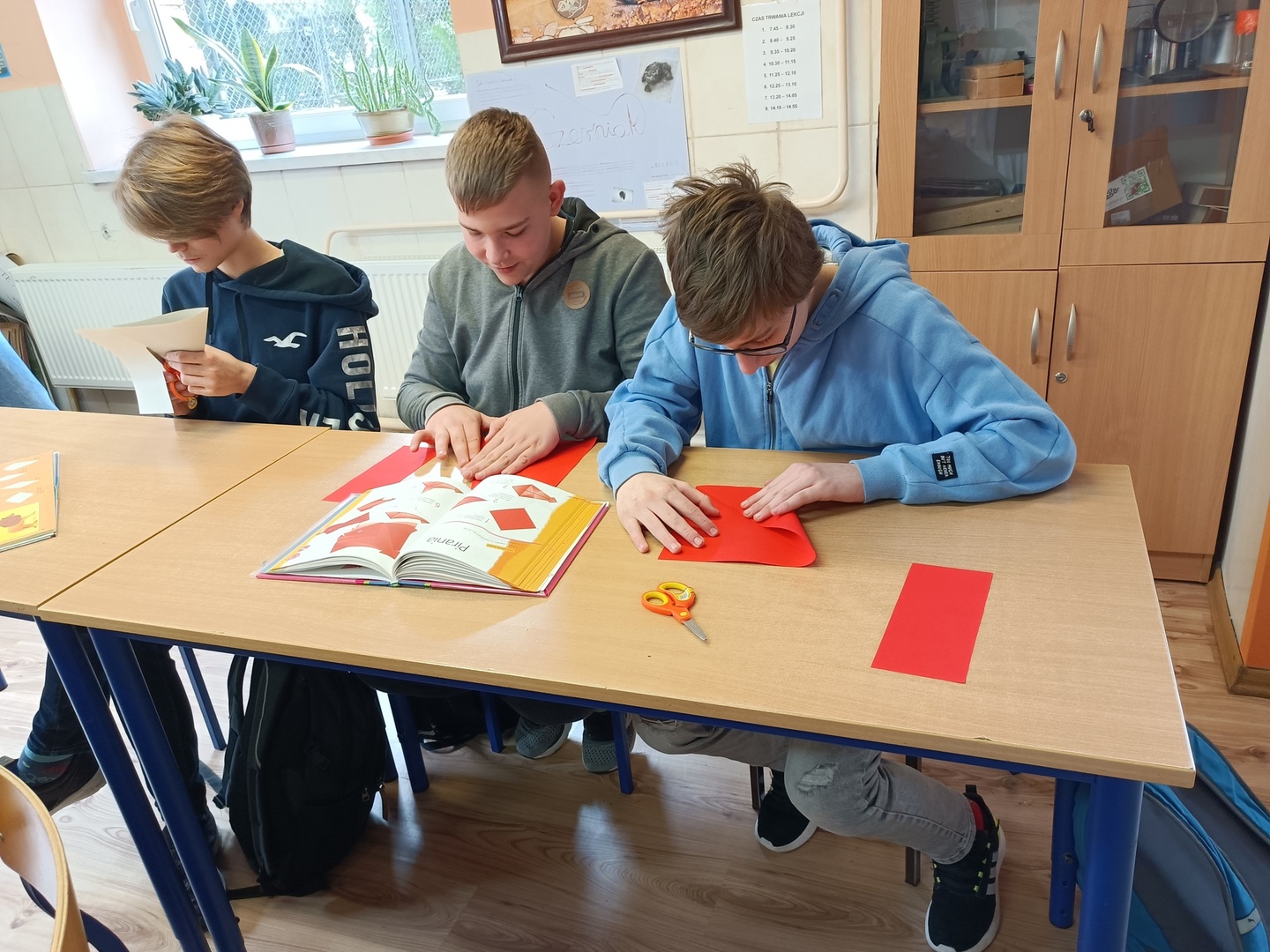 W dniu 21.03.2023. w klasie 8 odbyły się zajęcia biblioteczne z panią bibliotekarką z biblioteki w Myślinie Renatą Kudełką. Temat zajęć- Origami, sztuka składania papieru.