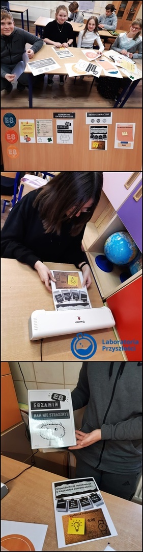 3 marca uczniowie klasy ósmej na zajęciach z wychowawcą wykorzystali laminator oraz folie do laminowania w celu przygotowania gazetki informacyjnej o egzaminie ósmoklasisty. Nauczyciel nadzorujący wykorzystanie sprzętu: K.Skorupa-Niemasik