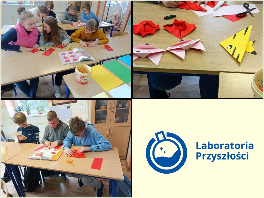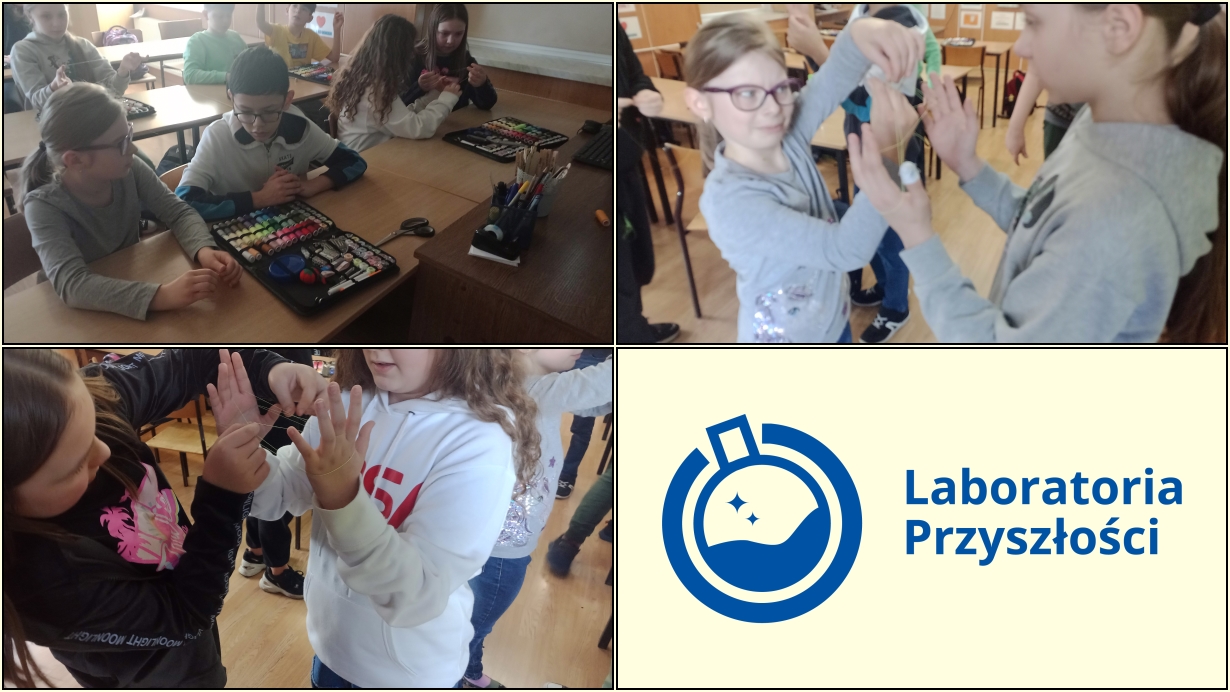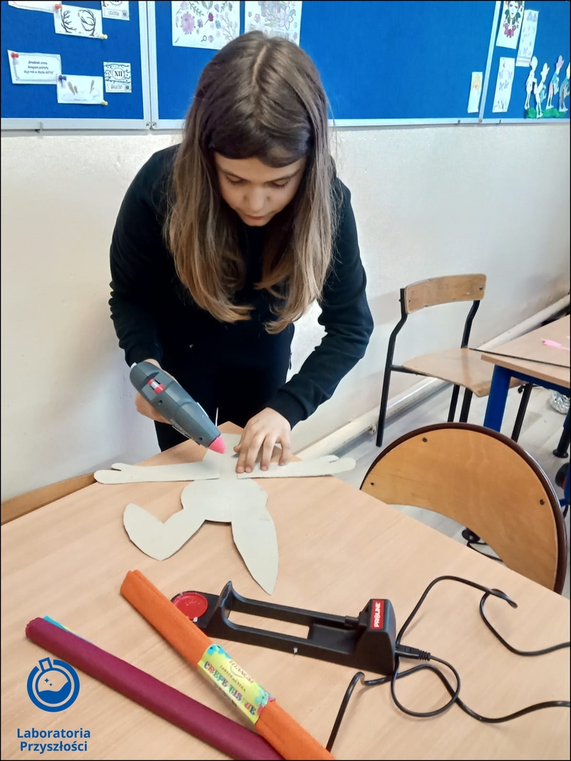 3 marca podczas zajęć z edukacji plastycznej uczniowie klasy trzeciej użyli nożyczek z ergonomicznym uchwytem oraz nici z zestawów krawieckich zakupionych w ramach programu „Laboratoria Przyszłości”, przy pomocy których wykonali bociany do powieszenia w oknach klasy. Nauczyciel nadzorujący wykorzystanie sprzętu: D.Leja
