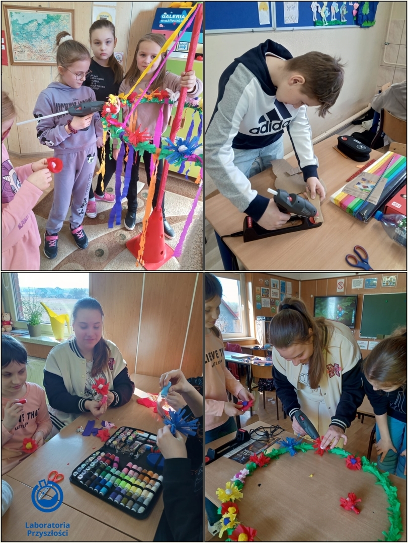 16 i 17 marca uczniowie klasy drugiej i szóstej na zajęciach plastyki robili gaik na powitanie wiosny. Do wykonania kwiatów z bibuły wykorzystywali nici i nożyczki. Kwiaty były mocowane do okręgu i na gałązkach przy pomocy pistoletu i kleju na gorąco. Nauczyciel nadzorujący wykorzystanie sprzętu: B.Szumilas