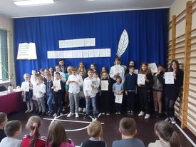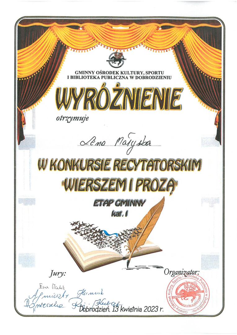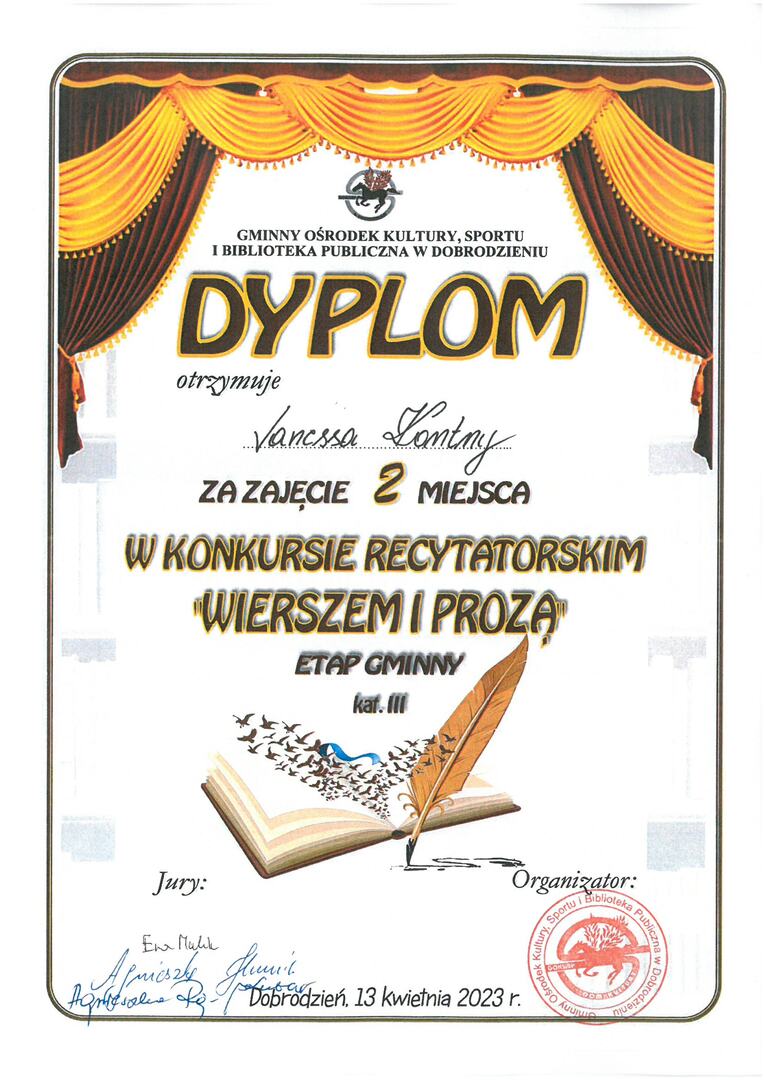 Drugi etap (gminny) Konkursu recytatorskiego Wierszem i prozą odbył się 13 kwietnia 2023r. w Dobrodzieńskim Domu Kultury. Naszą szkołę reprezentowali Lena, Tymon, Zuzanna, Marcel, Laura i Vanessa. W tym etapie uczestnicy recytowali dwa utwory poetyckie (kl. I – III), z kolei starsi uczniowie wiersz i dowolny fragment prozy. Pierwsze miejsce w kategorii kl. VII – VIII zajęła Laura, drugie - Vanessa i obie będą reprezentowały naszą szkołę na szczeblu powiatowym. Lenka z kl. II otrzymała wyróżnienie. Wszystkim recytatorom gratulujemy, a ósmoklasistkom życzymy powodzenia na dalszym etapie.
