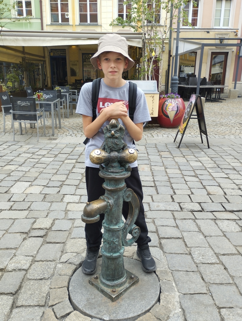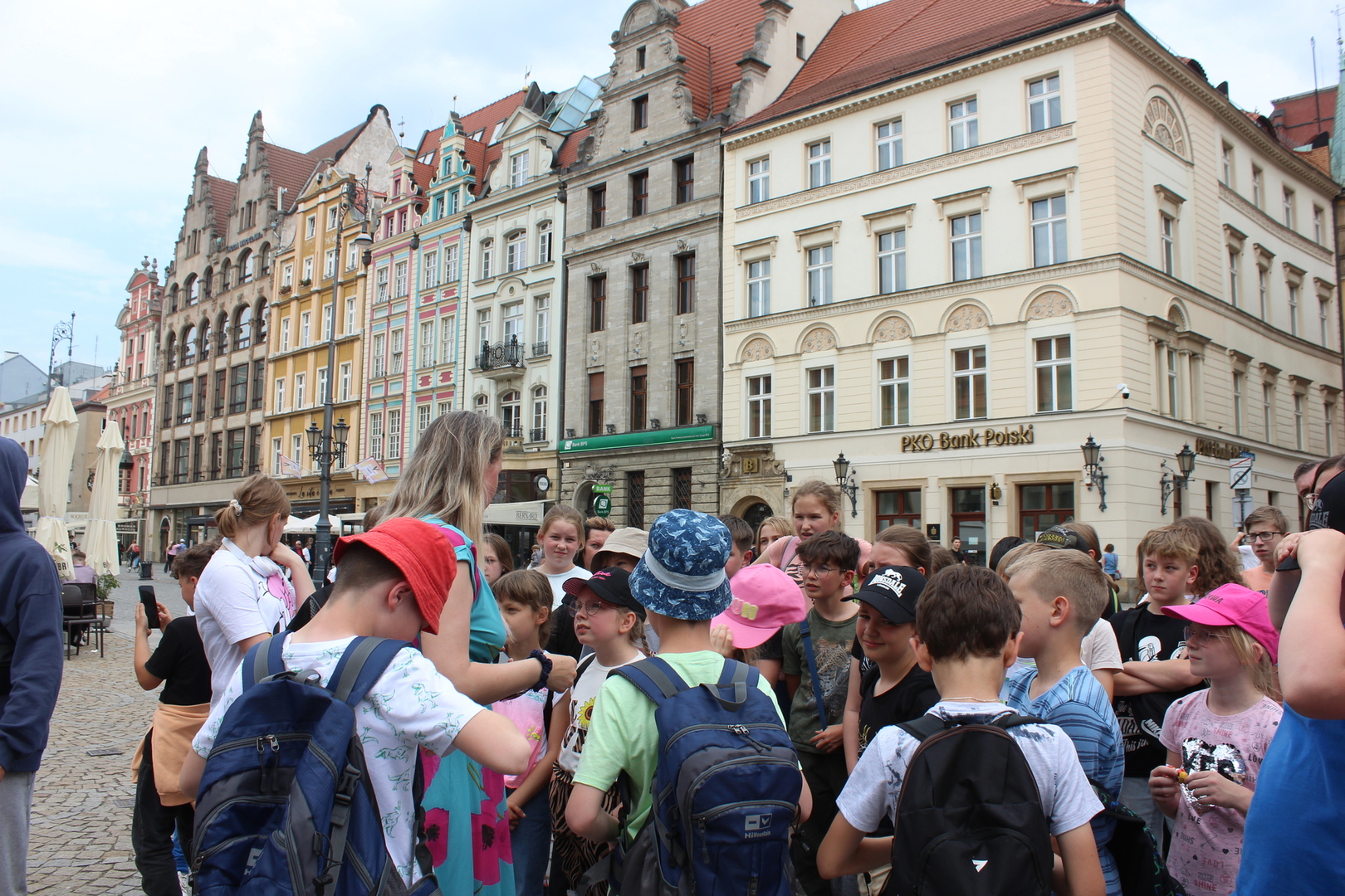 Kolejny punkt programu wycieczki stanowiła Perła Wrocławia czyli Rynek - uważany za jeden za piękniejszych w Polsce. Podziwialiśmy tam liczne malownicze, przedwojenne kamieniczki, które zostały przepięknie odrestaurowane, Stary i Nowy Ratusz, pręgierz, pomnik Aleksandra Fredry oraz fontannę Zdrój. Tutaj spotkała nas wielka detektywistyczna przygoda - szukanie słynnych wrocławskich krasnali. Cieszyliśmy się z każdego napotkanego krasnoludka. Wszystkim nam chodziło o odnalezienie jak największej liczby niewielkich rzeźb tych małych stworków. Najbardziej spostrzegawczym udało się odszukać i sfotografować aż 31 krasnali. W całym mieście jest ich już ponad 800, a ich liczba stale rośnie, ponieważ są one umieszczane we Wrocławiu sukcesywnie od 2005 roku, czasem nawet co miesiąc.