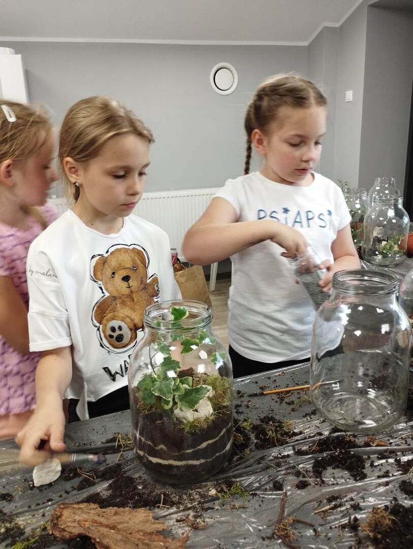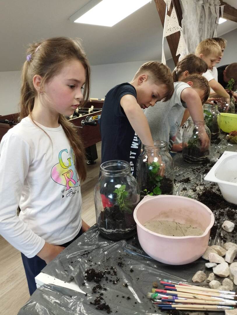 Uczestnicy wyjazdu wzięli udział także w kreatywno - ekologicznych warsztatach „Las w słoiku”. Dzieci miały okazję sprawdzić się w roli małych ogrodników, wykazać się pomysłowością w tworzeniu tej naturalnej kompozycji, a także dowiedzieć się o właściwej pielęgnacji roślin w słoiku. Efekt końcowy zachwycił każdego! Uczestnicy po warsztatach zabrali wykonane przez siebie kompozycje do domu, gdzie będą „opiekować się” swoją roślinką.