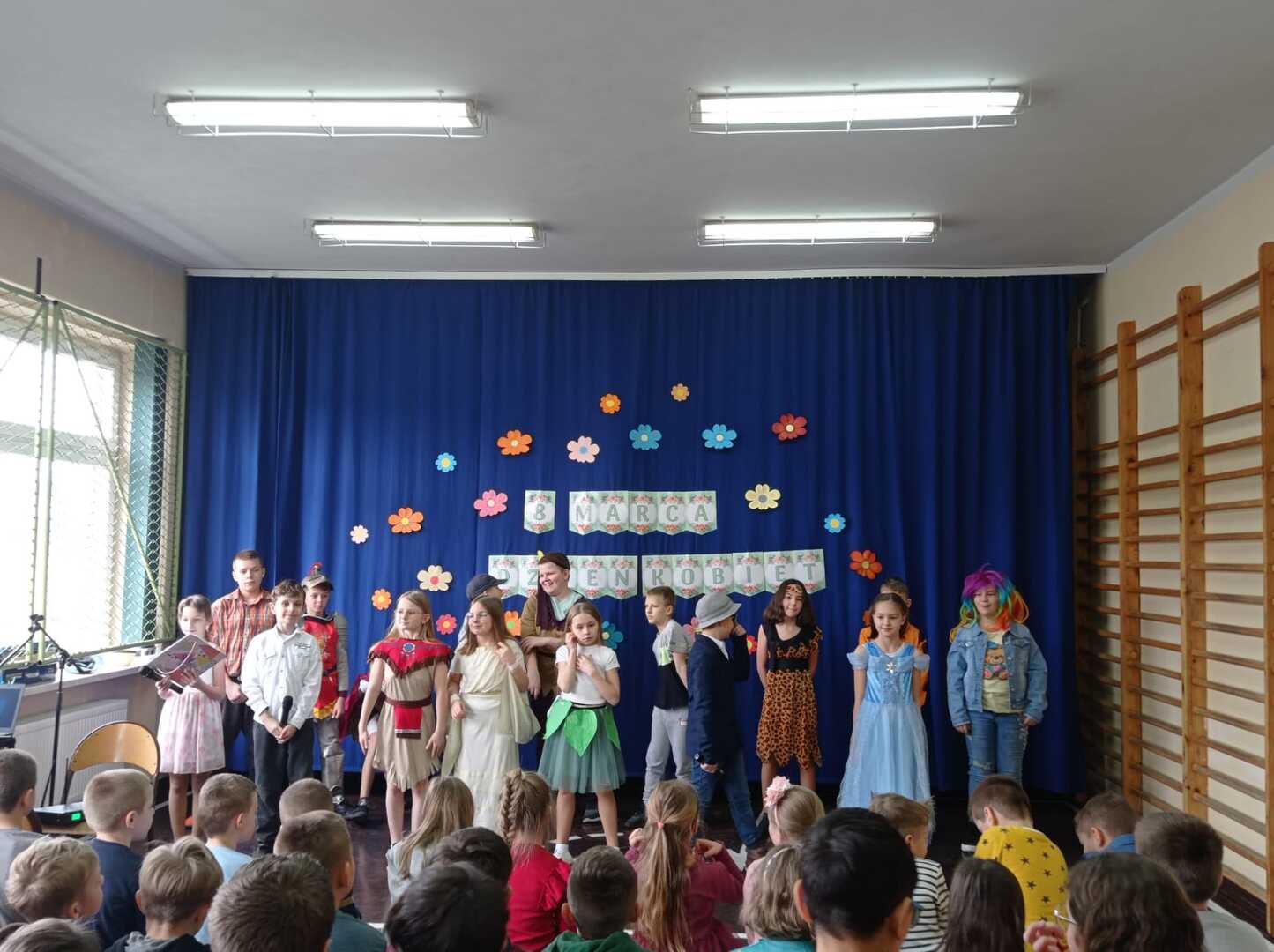 Dzień 8 marca – czyli Dzień Kobiet to święto żeńskiej części globu ziemskiego. Z tej okazji uczniowie klasy 4 przygotowali inscenizację słowno- muzyczną, w czasie której mogliśmy udać się na krótką wędrówkę przez wieki i przyjrzeć się płci pięknej z różnych perspektyw. Na początku przenieśliśmy się do czasów Adama i Ewy, następnie przyjrzeliśmy się jak wyglądała kobieta w epoce kamienia łupanego. Kolejny przystanek to były czasy starożytne, czyli kobieta przypominająca boginię, następnie średniowiecze – dama i rycerz jej serca, odwiedziliśmy także wioskę wojowniczego plemienia Apaczów. Na zakończenie wróciliśmy do współczesności, w której mogliśmy zobaczyć najnowsze wcielenie kobiety...