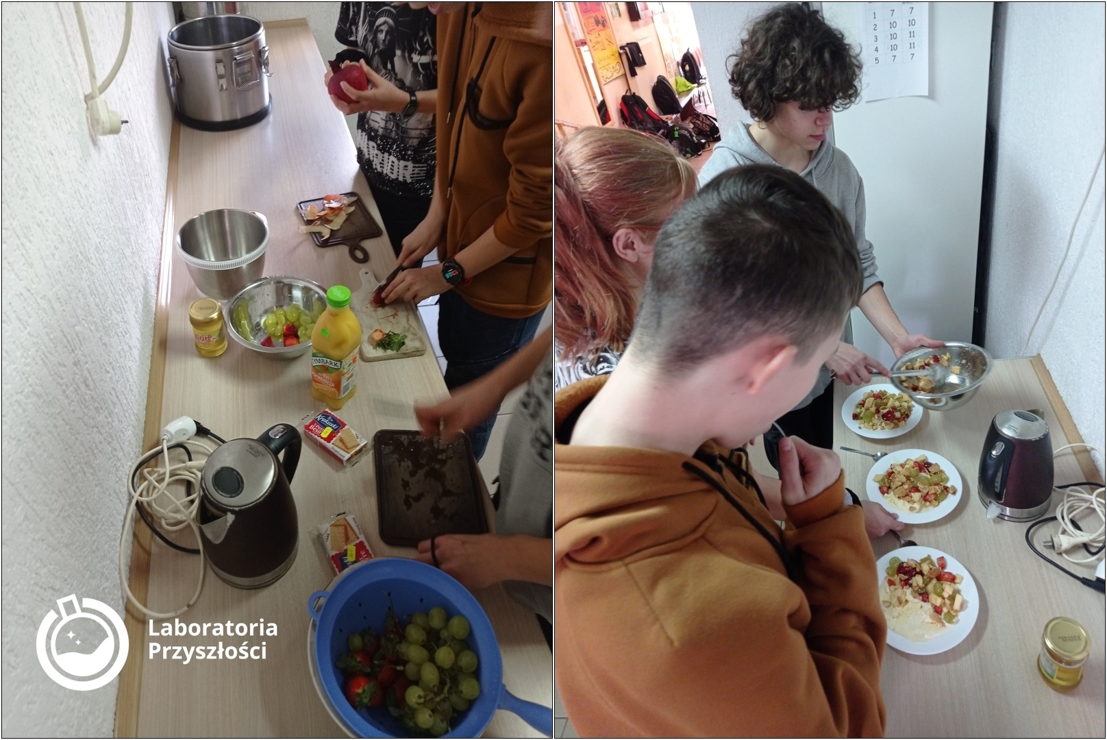 4 marca, na zajęciach języka angielskiego, uczniowie klasy ósmej wykorzystali miski do mieszania zakupione w ramach LABORATORIÓW PRZYSZŁOŚCI i przygotowali, z wykorzystaniem przepisu z podręcznika (dział , żywienie), sałatkę owocową. (J.Kłopotowska)