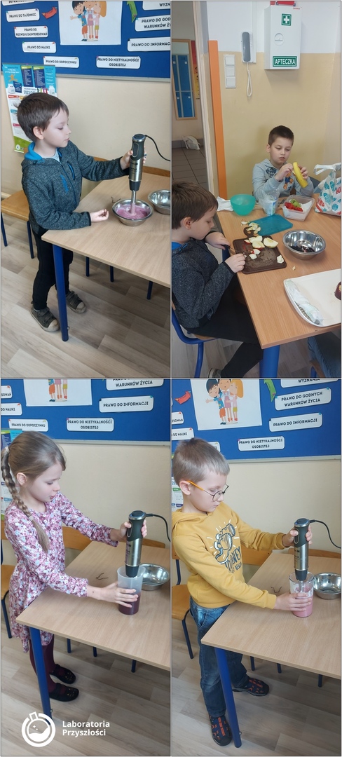 4 marca uczniowie klasy drugiej przygotowali w ramach zdrowego śniadania koktajle oraz sałatki owocowe. Do tego celu wykorzystała blender kielichowy oraz metalowe miseczki zakupione w ramach programu Laboratoria Przyszłości. (R.Kurek)