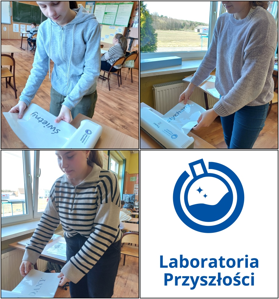 W dniu 19 marca na zajęciach został wykorzystany laminator z foliami, do wykonania napisu na gazetkę szkolną. (M.Kurc)
