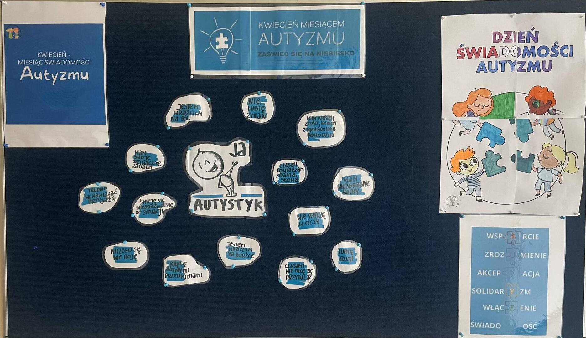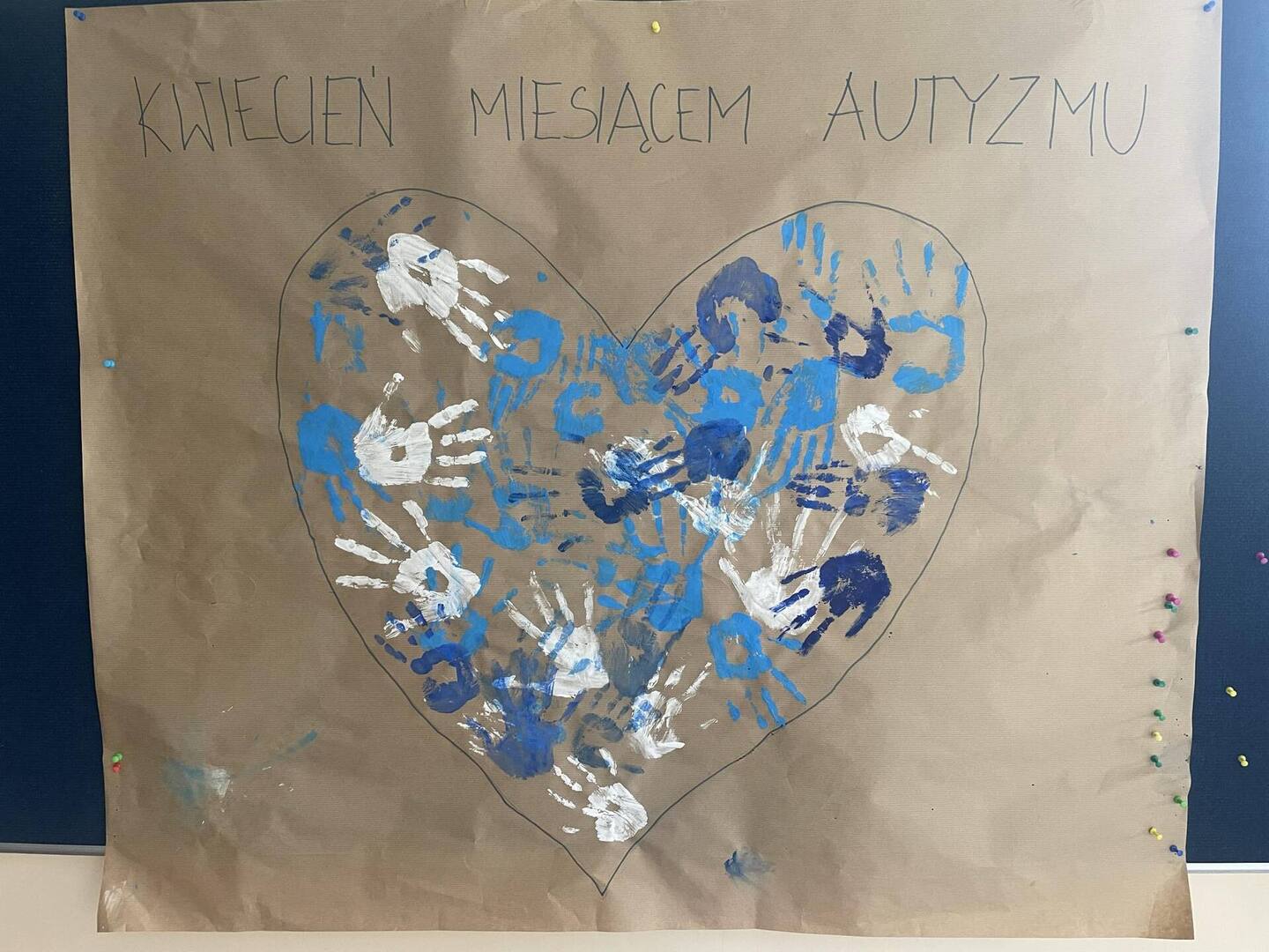 Kwiecień uznany jest jako miesiąc wiedzy o autyźmie. Z tej okazji na początku kwietnia przygotowano gazetkę na temat zaburzeń ze spektrum autyzmu, którą częściowo pomogli stworzyć uczniowie. W ramach solidarności z osobami ze spektrum uczniowie naszej szkoły stworzyli serce ze swoich dłoni. Zorganizowano także dla uczniów klasy V i VI zajęcia warsztatowe pt. „Autyzm – co to znaczy?”, które zostały przeprowadzone przez psychologa i pedagoga szkolnego. Celem akcji było podnoszenie świadomości na temat autyzmu, trudności z jakimi borykają się osoby dotknięte tym zaburzeniem oraz kształtowanie postawy tolerancji i szacunku dla drugiej osoby.
