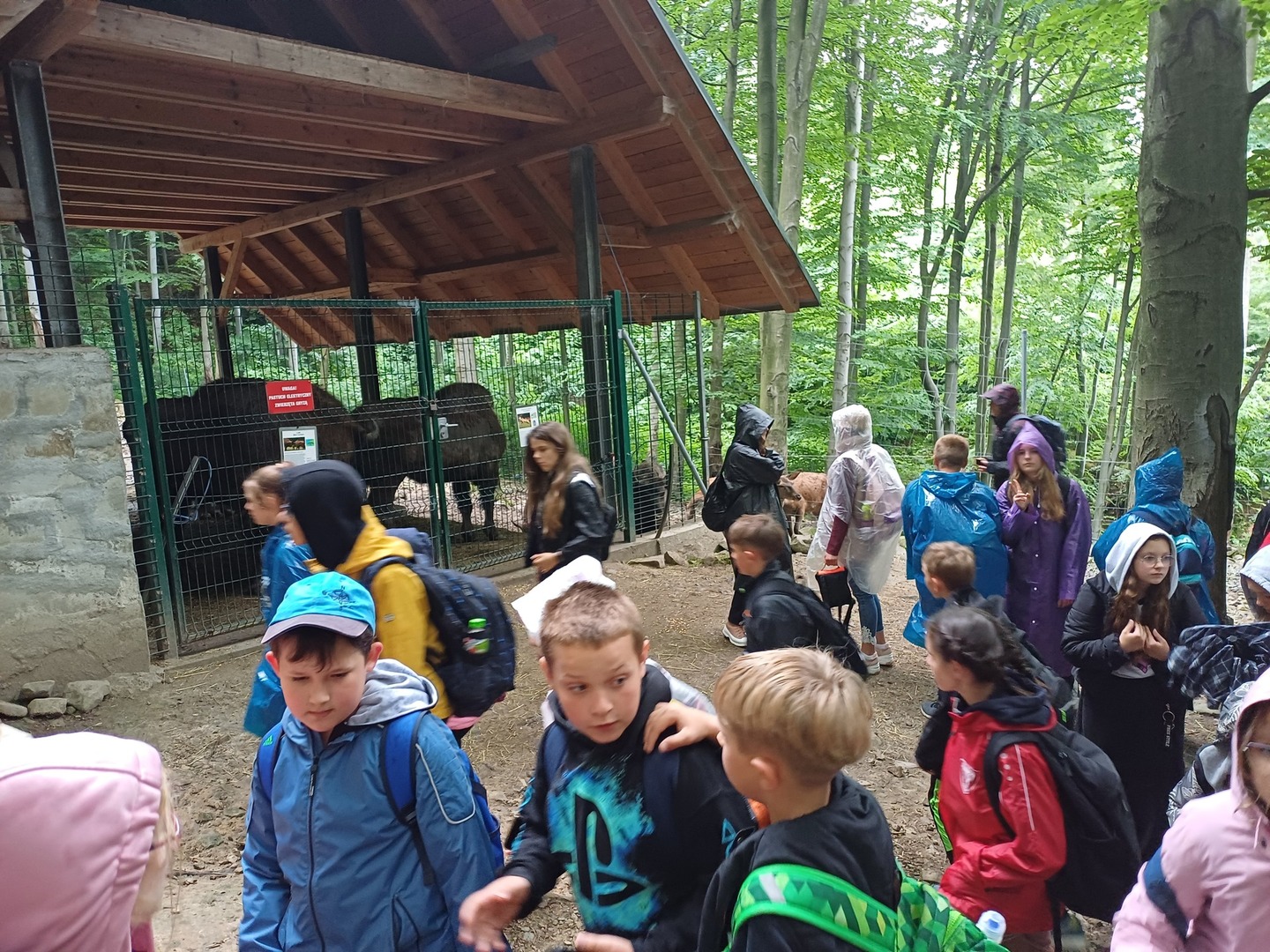 Z takim mottem uczniowie klas IV – VIII wyruszyli 12 czerwca na wycieczkę w Beskidy. Niestety, już w połowie drogi do Wisły pogoda szybko zmieniała swoją aurę i pokrzyżowała szyki… Padało, lało, kapało – i tak praktycznie cały dzień. Jednak deszcz nie popsuł nam humoru i chociaż zmieniliśmy plany, to wiele zwiedziliśmy. Nie wjechaliśmy wyciągiem na Czantorię, ponieważ warunki atmosferyczne nie były sprzyjające, ale w zamian udaliśmy się do Leśnego Parku Niespodzianek w Ustroniu, gdzie mieliśmy okazję przeżyć świetną przygodę z edukacją w tle. To tutaj uczestniczyliśmy w ciekawym pokazie lotów ptaków drapieżnych oraz sów. Spacerowaliśmy alejką bajkową, dzięki czemu przypomnieliśmy sobie znane baśnie. Stąd też niektórzy przywieźli pamiątkowe maskotki lamy, dzika czy sarenki.