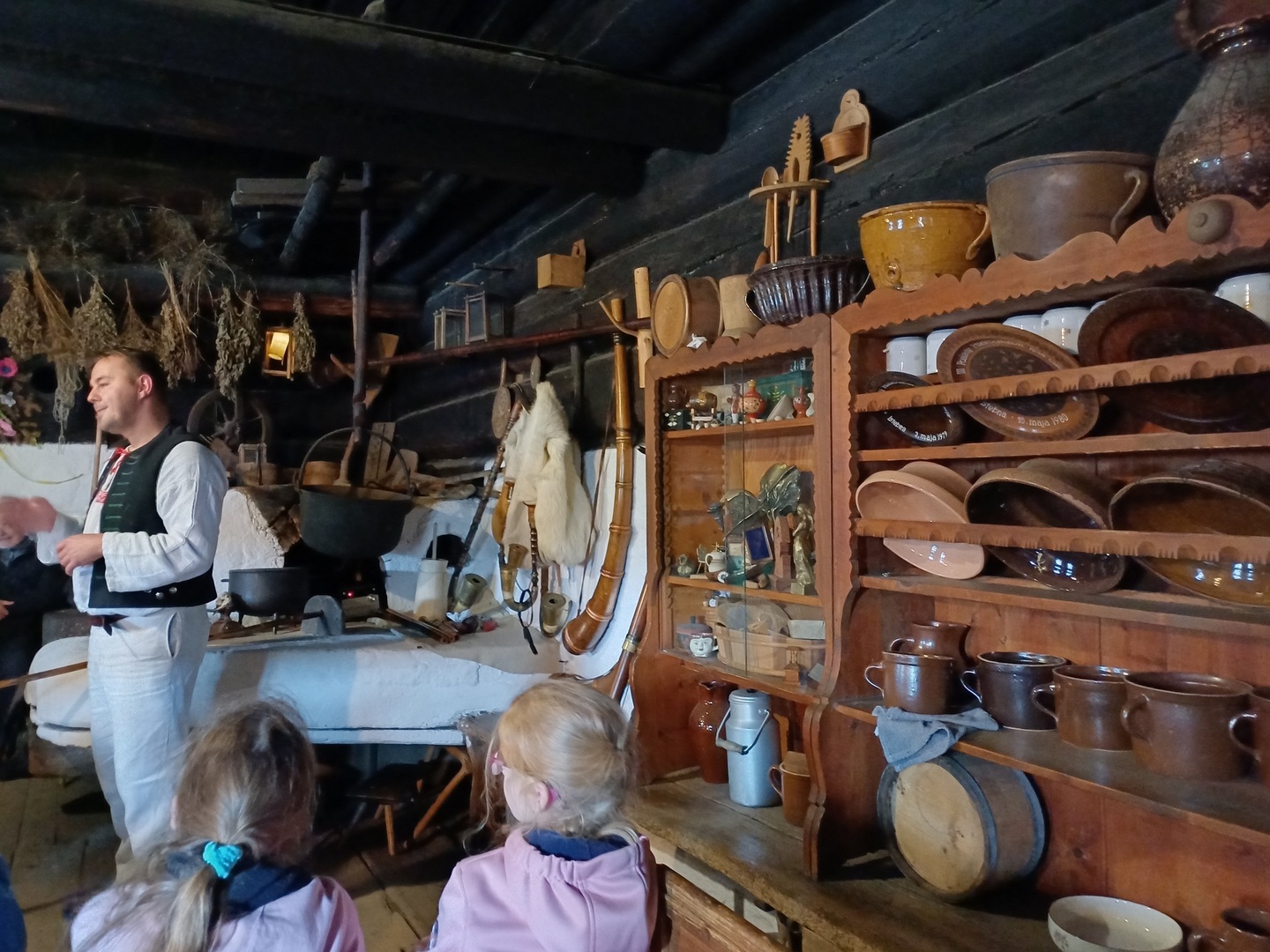 Następnie przejechaliśmy do Wisły, gdzie spacer w deszczu po centrum okazał się całkiem przyjemny. Dla przypomnienia zobaczyliśmy rzeźbę z czekolady słynnego skoczka – Adama Małysza. Kolejnym punktem dnia była Chata u Kawuloka w Istebnej. To była świetna lekcja historii tego regionu opowiedziana z humorem i wzbogacona anegdotami. A potem gospodarz chaty zabrał nas w muzyczną opowieść o instrumentach górali. Nawet niektórzy nasi uczniowie mieli okazję zagrać na kilku z nich.
