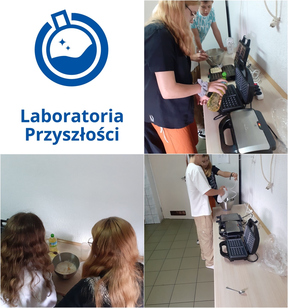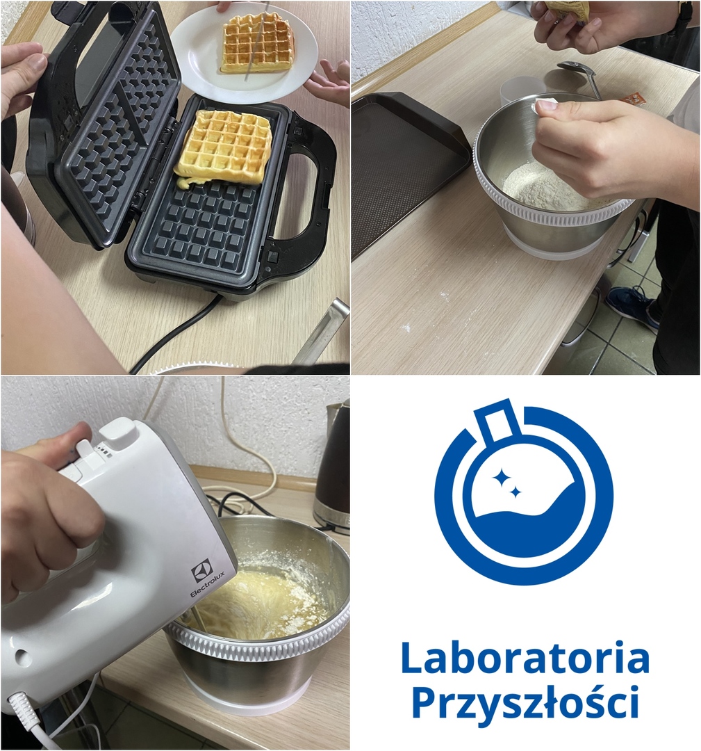 Uczniowie klasy siódmej w dniu 23 maja na lekcji wychowania fizycznego dokonali oceny swojego rozwoju fizycznego oraz utrwalili wiedzę na temat zdrowego żywienia i aktywności fizycznej. Wykorzystując pomoce zakupione w ramach programu Laboratoria Przyszłości, uczniowie wykonali deser - gofry. Za pomocą miksera z miską obrotową przygotowali ciasto, a w opiekaczu 4 w 1 (z wkładkami do gofrów) upiekli gofry. Potrzebne produkty zostały przyniesione przez uczniów. (P.Dudarewicz)