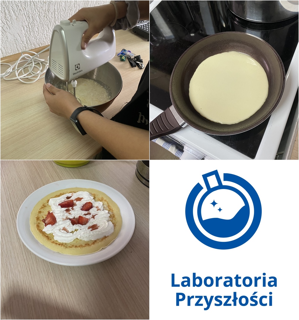 24 maja uczniowie klasy ósmej realizując na lekcji wychowania fizycznego temat zdrowego odżywiania przygotowali posiłek. Ósmoklasiści przynieśli niezbędne produkty oraz dodatki do wykonania zdrowych naleśników. Uczniowie wykorzystali m.in.: miskę, mikser, patelnię i kuchenkę elektryczną z płytą ceramiczną zakupione w ramach programu Laboratoria Przyszłości. (P.Dudarewicz)