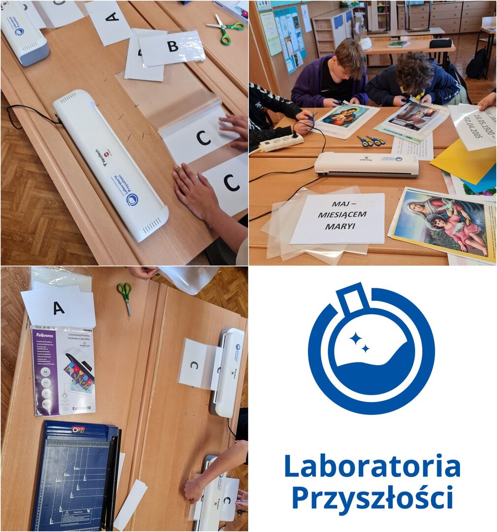 6 maja uczniowie kl. VIII przygotowali materiały potrzebne do konkursu wiedzy o św. Janie Pawle II przy użyciu laminatorów. (W.Mazurek)