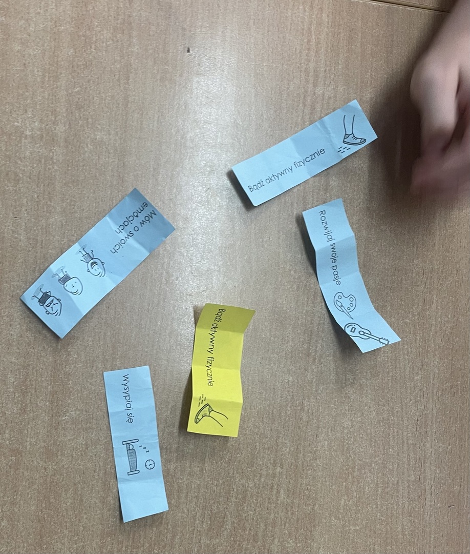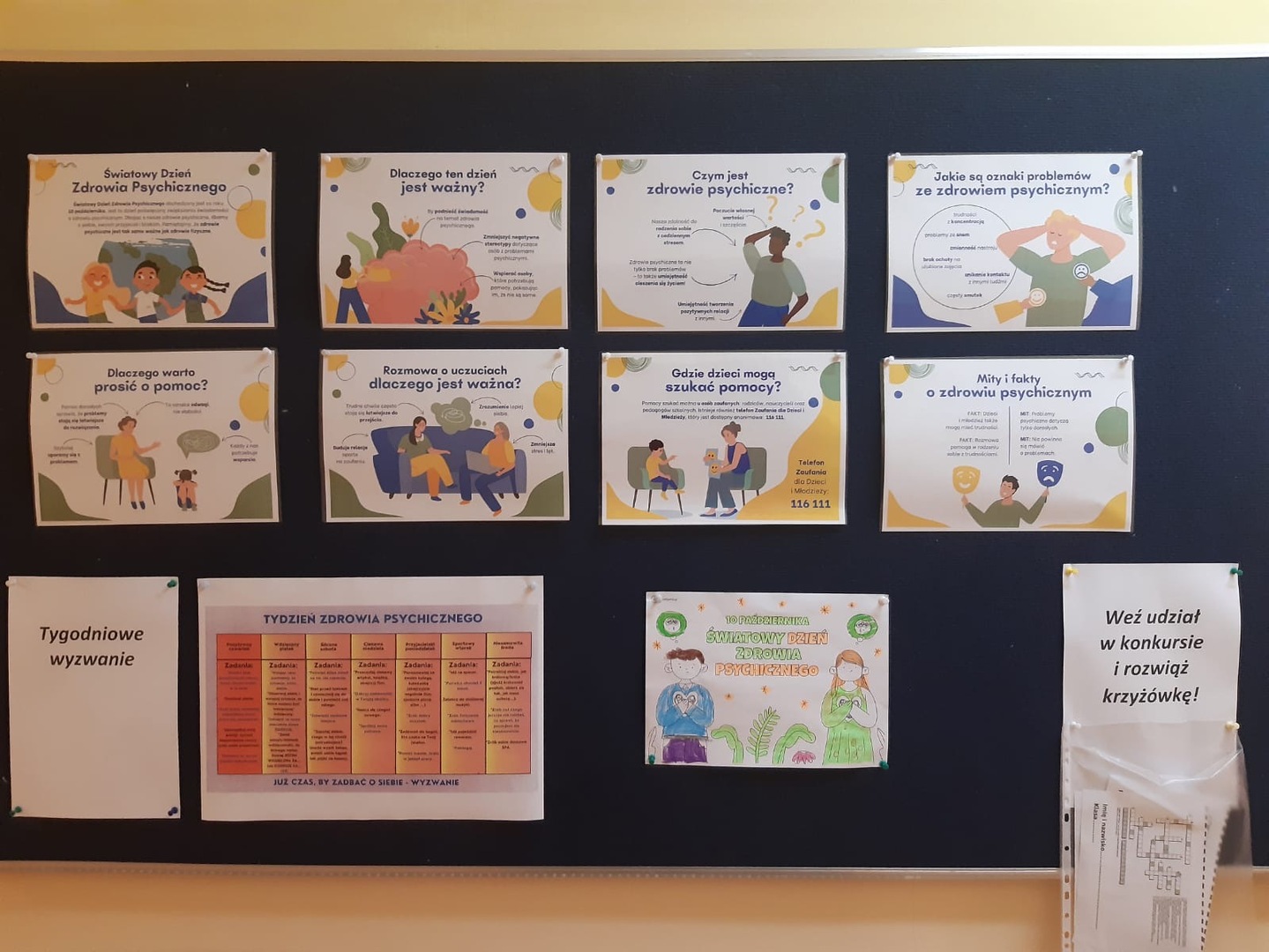Dnia 10 października obchodzony jest Światowy Dzień Zdrowia Psychicznego. Z tej okazji w naszej szkole została przeprowadzona przez pedagoga i psychologa szkolnego akcja podnosząca świadomość dbania o swoje samopoczucie. W celu przypomnienia uczniom jak ważne jest zdrowie i w jaki sposób należy o nie dbać, na szkolnym korytarzu pojawiła się gazetka tematyczna, a uczniowie losowali karteczki z propozycjami jak polepszyć swój nastrój i relacje z innymi. W klasie ósmej odbyły się warsztaty dotyczące tematyki zdrowia psychicznego i radzenia sobie z trudnościami. Podobne zajęcia zostały przeprowadzone w klasie IV i V, a celem było wyposażenie uczniów w wiedzę na temat sposobów radzenia sobie ze stresem.