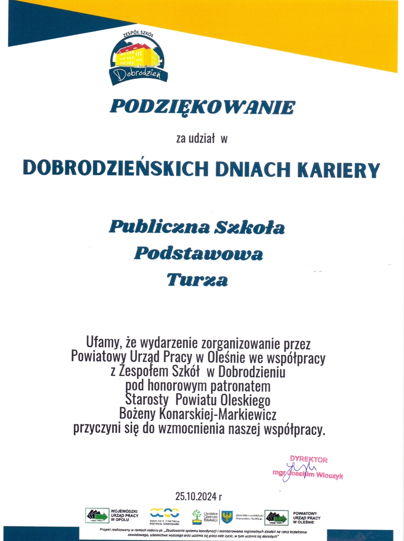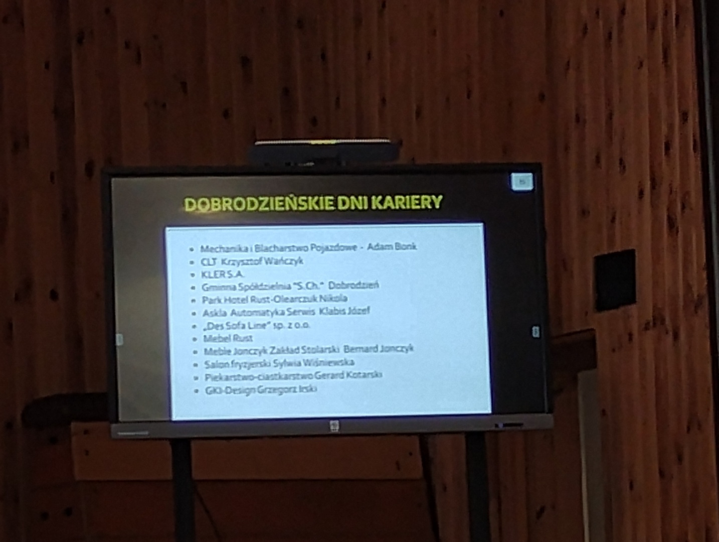 W piątek, 25. października, uczniowie klasy 7 i 8 wybrali się wraz z wychowawcami na zorganizowany, po raz pierwszy, przez Zespół Szkół w Dobrodzienia "DZIEŃ KARIERY". Uczniowie wzięli udział w prelekcjach wygłaszanych przez lokalnych przedsiębiorców i zapoznali się z możliwościami lokalnego rynku pracy. Oprócz, być może, przyszłych pracodawców z branży stolarskiej, cukierniczej czy służb mundurowych na wydarzeniu obecny był również dyrektor Powiatowego Urzędu Pracy w Oleśnie, przedstawiciele Poradni Psychologiczno-Pedagogicznej w Oleśnie oraz pani Burmistrz, Agnieszka Hurnik.