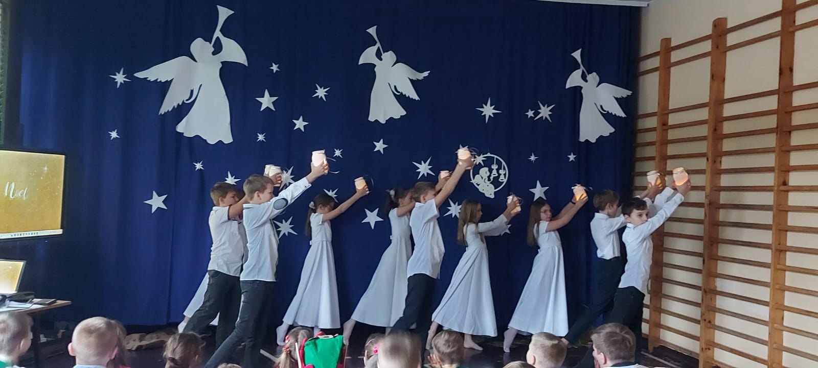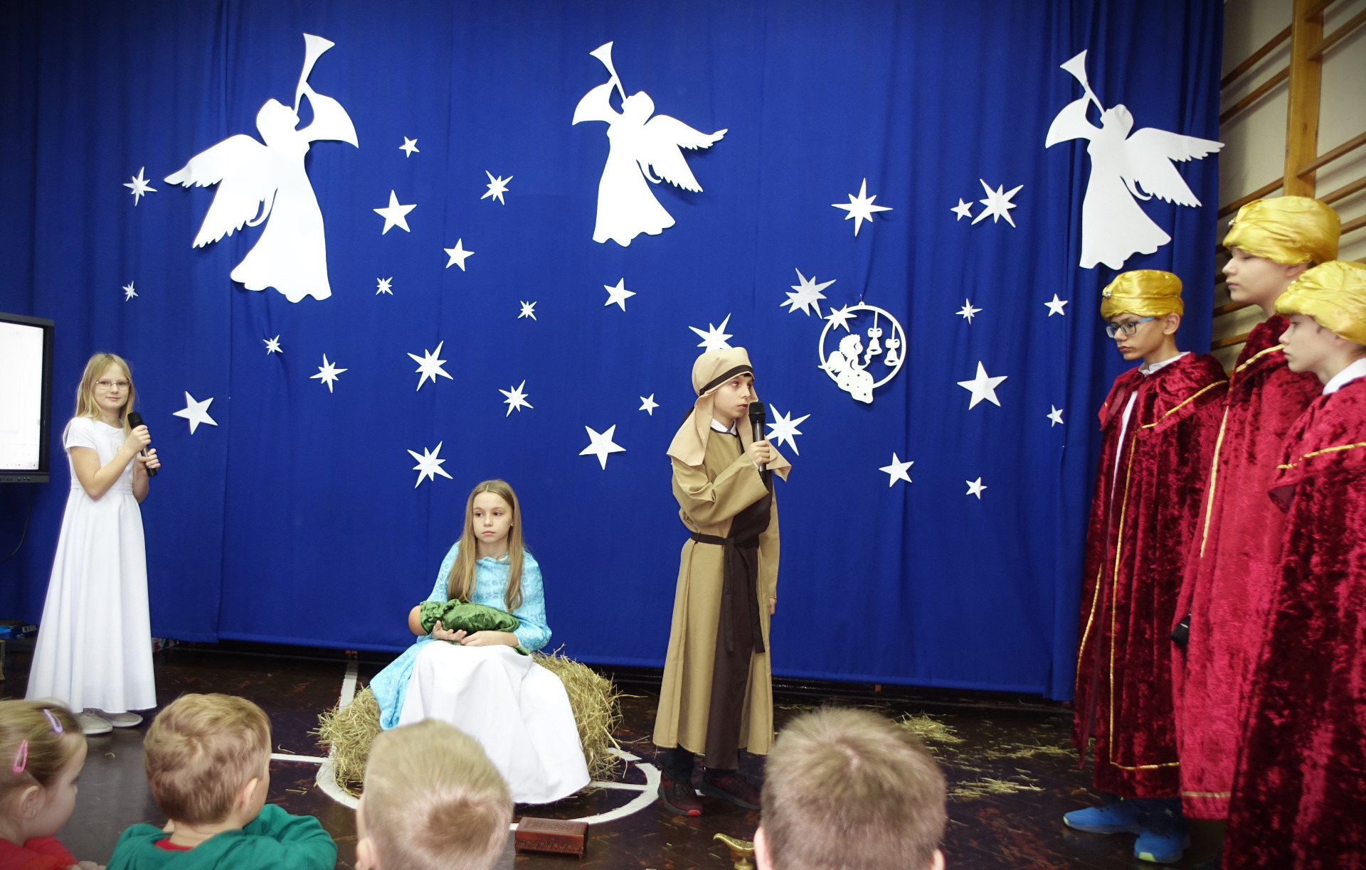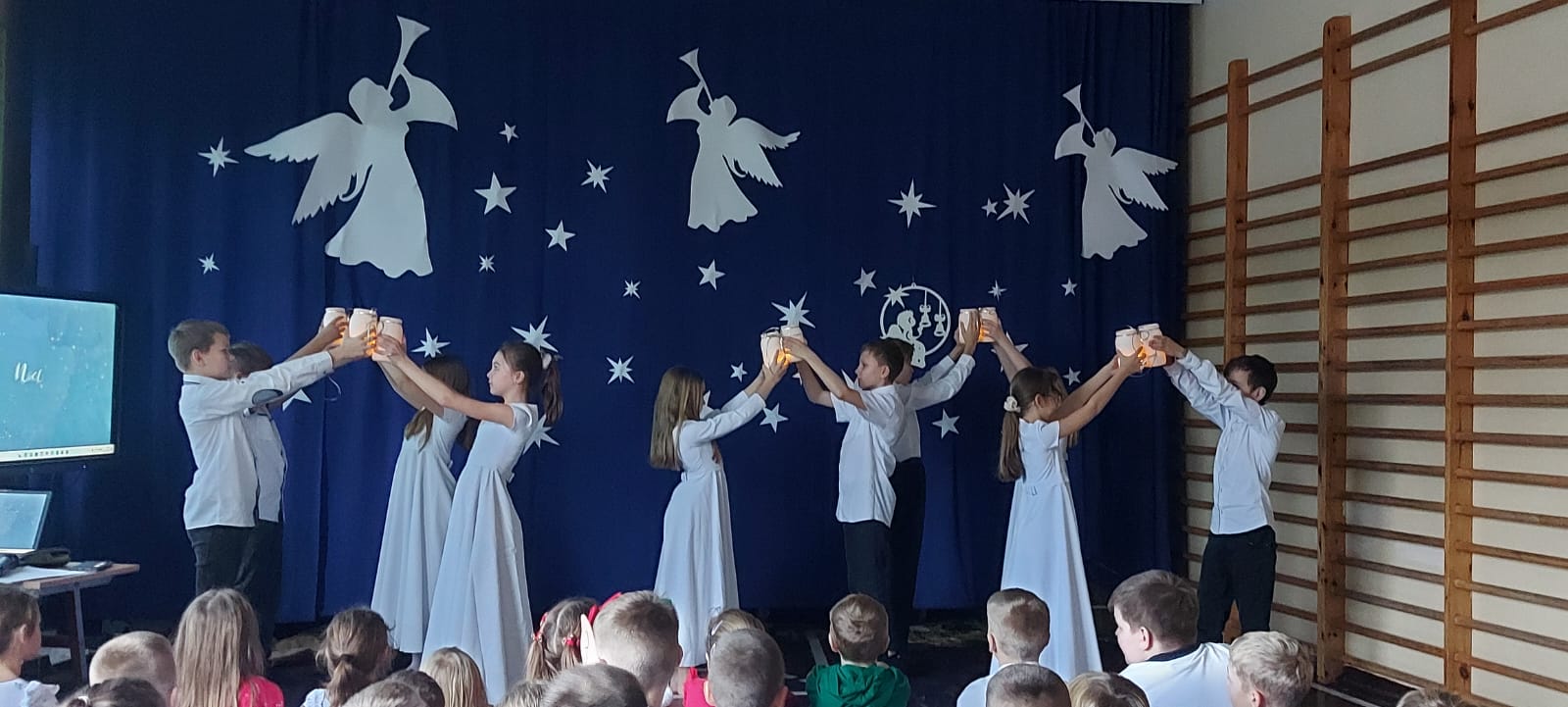 W dniu 20.12.2024 w naszej szkole przeżywaliśmy świętowanie Bożego Narodzenia. Klasy IV, V, VI przygotowały jasełka pt.: „Historia wnuka króla Melchiora”. Po jasełkach klasa V zatańczyła taniec z lampionami do piosenki „Noel” Katarzyny Cerekwickiej i TGD, następnie wspólnie kolędowaliśmy. Rozstrzygnięto konkursy: na najładniejszą szopkę bożonarodzeniową, na najładniejszą ozdobioną świątecznie klasę za co uczniowie otrzymali nagrody wręczone przez pana Dyrektora.