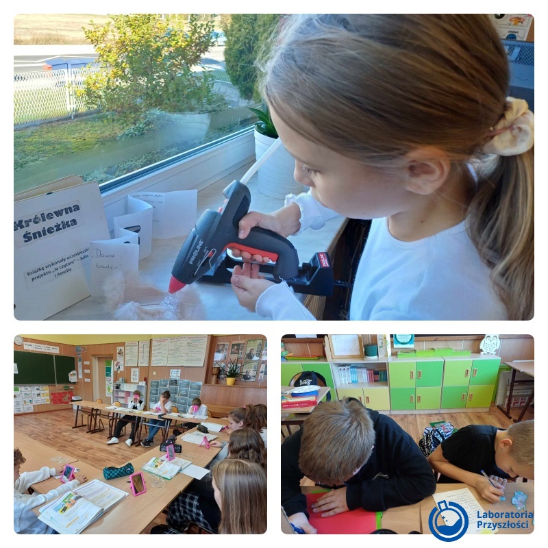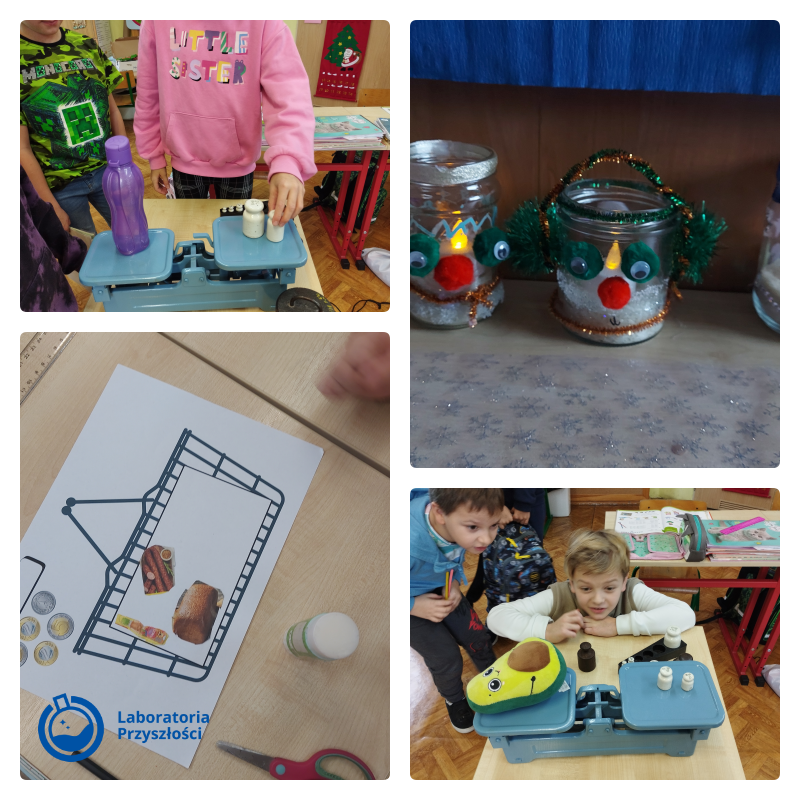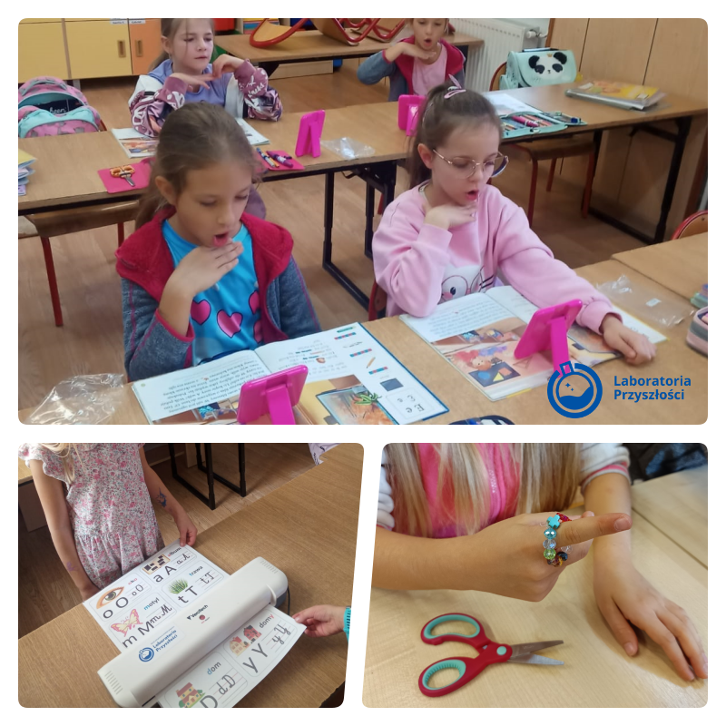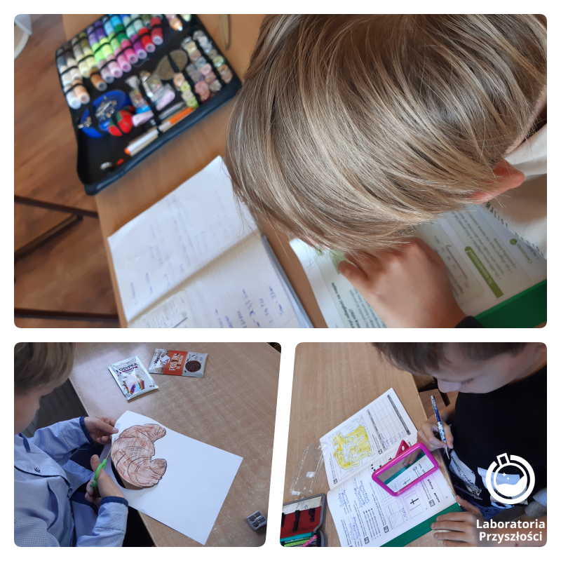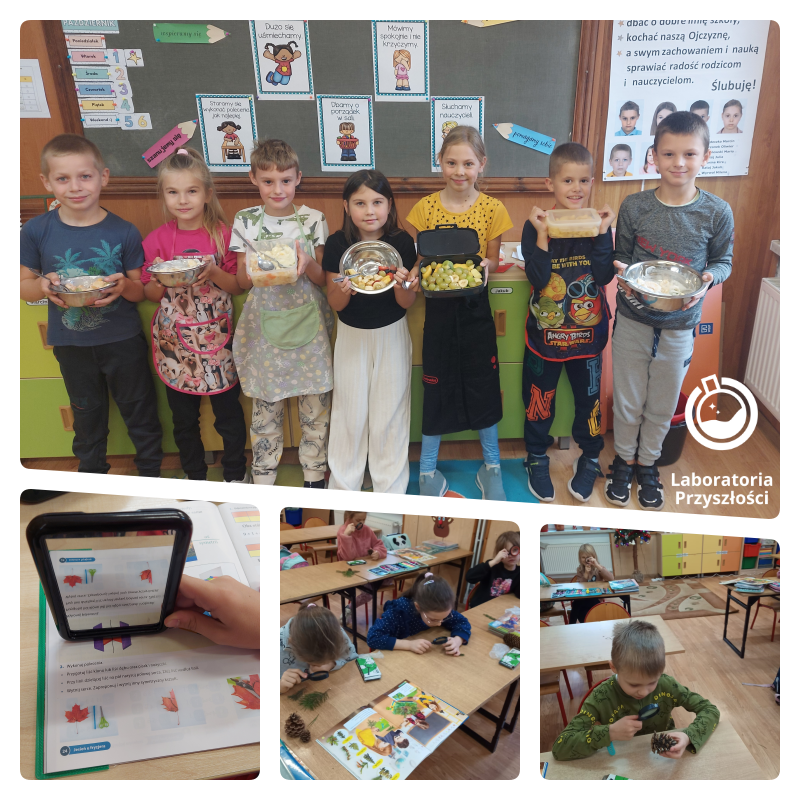 Uczniowie klasy trzeciej prowadzili obserwacje przyrodnicze w terenie z wykorzystaniem lup zakupionych w ramach programu „Laboratoria Przyszłości”. W klasie trzeciej do wykonania mozaiki z papieru i bibułki wykorzystano nożyczki. Podczas zajęć o emocjach trzecioklasiści patrzyli na odbicie swoich twarzy w lusterkach zakupionych w ramach programu „Laboratoria Przyszłości” i próbowali pokazać różne emocje oraz je nazwać.